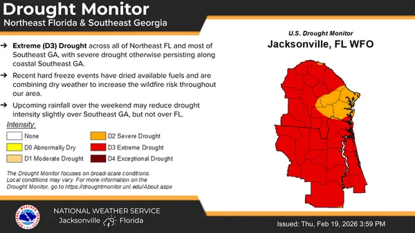 As the rain departs, the primary weather concern shifts from water to fire. A Red Flag Warning is in effect for Sunday afternoon and evening. Northwesterly winds are expected to intensify, with sustained speeds of 15 to 20 mph and gusts reaching between 25 and 35 mph. Combined with a plummeting relative humidity of roughly 25% and ongoing extreme drought conditions in Duval County, any outdoor fires could spread rapidly. Residents are strongly advised to avoid any outdoor burning and to exercise extreme caution with potential ignition sources.